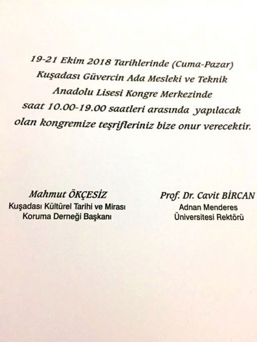 19 Ekim 2019 Cuma günü başlayacak ve 21 Ekim Pazar günü sona erecek olan 1. Uluslararası Türk-İslam Mezar Taşları Kongresinin resmi davetiyeleri hazırlandı. 8 Ekim 2018 Pazartesi den itibaren dağıtılmaya başlanacak olan davetiyelerimiz Kuşadası ve Aydın başta olmak üzere ülkemizin her bir köşesine gönderilecektir. Kuşadası Güvercinada Mesleki ve Teknik Anadolu Lisesi Kongre Merkezinde yapılacak kongrenin açılış töreni saat 10.00 da başlayacaktır. Kongremize teşrifleriniz bize onur verecektir.