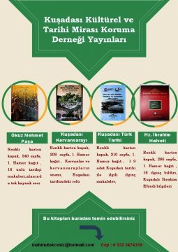 Kuşadası Kültürel ve Tarihi Mirası Koruma Derneği 2014 yılından itibaren sempozyumlar yapmaya başlamış ve bu sempozyumlardaki bildirileri kitap halinde yayınlamıştır. Bugüne kadar yaptığımız 5 sempozyumun 3 tanesini derneğimiz, 1 tanesini Erciyes üniversitesi yayınlamış ve 1 tanesi de rektör değişikliği nedeniyle basılamamıştır. Buna ilaveten bir de Kervansaray kitabı hazırladık ve yayınladık . Gelen yoğun talep üzerine stoklarımızda bulunan sınırlı sayıdaki bu kitaplardan 4 tanesini isteyenlere göndermeye karar verdik. Ekli görselde görebileceğiniz bu yayınlarımızdan edinmek isteyenler bizimle temasa geçebilirler.