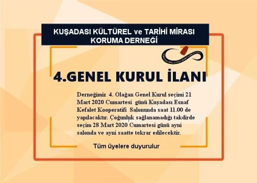 Kuşadası Kültürel ve Tarihi Mirası Koruma Derneği 4. Olağan Genel Kurul seçimi 21 Mart 2020 Cumartesi günü Kuşadası Esnaf Kefalet Kooperatifi Salonunda saat 11.00 da yapılacaktır. Çoğunluk sağlanamadığı takdirde seçim 28 Mart 2020 Cumartesi günü ayni salonda ve ayni saatte tekrar edilecektir.