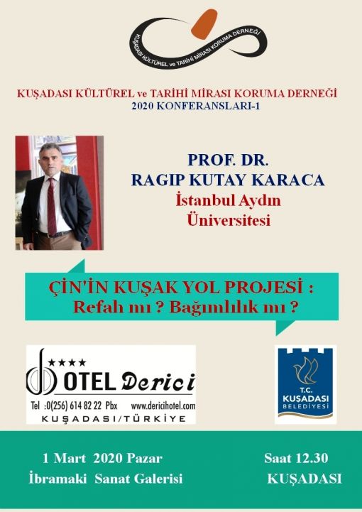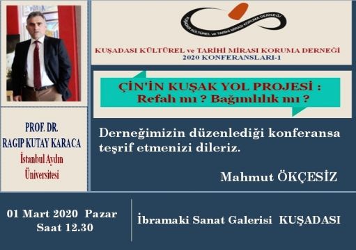 1 Mart 2020 Pazar günü saat 12.30 da Kuşadası İbramaki Sanat Galerisinde derneğimiz tarafından bir konferans düzenlenecektir. İstanbul Aydın Üniversitesi öğretim üyesi Prof. Dr. Ragıp Kutay KARACA' nın vereceği " Çin'in Kuşak Yol Projesi : Refah mı ? Bağımlılık mı ? " adlı bu söyleşiye tüm Kuşadası halkı davetlidir.