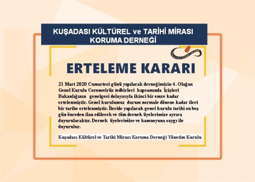 21 Mart 2020 Cumartesi günü yapılacak derneğimizin 4. Olağan Genel Kurulu Coronovirüs tedbirleri kapsamında İçişleri Bakanlığının genelgesi dolayısıyla ikinci bir emre kadar ertelenmiştir. Genel kurulumuz durum normale dönene kadar ileri bir tarihe ertelenmiştir. İleride yapılacak genel kurulu tarihi on beş gün önceden ilan edilecek ve tüm dernek üyelerimize ayrıca duyurulacaktır. Dernek üyelerimize ve kamuoyuna saygı ile duyurulur.