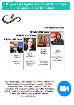 Kuşadası Kültürel ve Tarihi Mirası Koruma Derneği’nin iki yıldır zoom üzerinden yayın yaptığı Kuşadası Digital Akademi’de Şubat ayında bir birinden ilginç ve önemli konferanslar düzenlenecektir. İlk konferansımız 4 Şubat 2022 Cuma günü; Balkanlarda ses bayrağımız Türkçe’mizi dergi olarak 24 yıldır yayınlayan değerli şair ve yazar Zeynel BEKSAÇ “ Türkçem Dergisi” ni bize anlatacak.. İkinci hafta 11 Şubat 2022 Cuma günü ; Türk tarihi araştırmacısı değerli akademisyen Doç. Dr. Elvin YILDIRIM “ Türk Bozkır Kültürünün Doğuşu “ adlı nefis çalışmasını akademimiz de sunacak. Üçüncü hafta 18 Şubat 2022 Cuma günü Azerbaycan’da çok önemli araştırmalara imza atan Doç. Dr. Habibe ALİYEVA “ Azerbaycan Koç Başlı Kabir Taşları “ adlı konferansı ile Türk defin kültüründen nefis örnekler verecek.. Şubat ayının son konferansı ise 25 Şubat 2022 Cuma günü Batı Trakya Türklüğünün sembolü, büyük adamı şehit Dr. Sadık AHMET beyin unutulmaz mücadelesini değerli eşi Işık AHMET hanımdan “ Dr. Sadık AHMET ve Batı Trakya “ konferansı olarak dinleyeceğiz. Bu dört güzel konferansımıza katılmak isteyenler, ekteki görselde verdiğimiz e-mail adresine başvurarak kayıt yaptırmaları gerekmektedir. Kamuoyuna saygıyla ilan olunur.