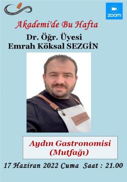 Kuşadası Digital Akademi de bu hafta, 17 Haziran 2022 Cuma günü saat 21. 00 de Adnan Menderes Üniversitesi Davutlar MYO Dr. Öğretim üyesi Emrah Köksal SEZGİN konuğumuz olacaktır. Emrah Bey , “ Aydın Gastronomisi (Mutfağı) “adlı önemli bir konferans verecektir. Bu önemli konferansa katılmak isteyenlerin 17 Haziran 2022 Cuma günü saat 18.00 kadar “ mahmutokcesiz@hotmail.com “ adresine mail gönderip kayıt olmaları gerekmektedir. Kontenjanımızın sınırlı olduğunu belirtir, acele edilmesini tavsiye ederiz. Kamuoyuna saygıyla ilan olunur.