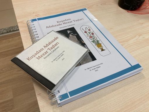 İki senedir Kuşadası Belediyesi ile birlikte çalıştığımız Adalızade Mezar Taşları Müzesi’nde sergilenecek 180 mezar taşının “ envanter çalışmasının “ bittiğini ve 208 sayfa olarak Kuşadası Belediyesine teslim edildiğini daha önce yazmıştık. Biz bu 208 sayfalık envanterden özel olarak 15 adet bastırttık ve özel istek yapan arkadaşlara takdim ettik. Bu envanterden bir tanesini de bugün derneğimiz hukuk müşaviri sayın Mehmet AYGÜNEŞ beye ofisinde teslim ettik. 208 sayfa renkli, 180 mezar taşının tüm özelliklerini yansıtan bu hazine değerindeki kitap Kuşadası’nın “ hafıza mekanlarından “ biri olarak kütüphanelerde yer almaya başladı. Dileğimiz bu güzel kitabın 1000 adet bastırılıp dağıtılması ve Kuşadası halkının geçmişini ve ecdadını tanımasına fırsat verilmesidir.
