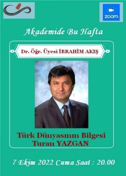 Kuşadası Digital Akademide bu hafta, 7 Ekim 2022 Cuma günü saat 20. 00 de, İstanbul Üniversitesi Cerrahpaşa Hasan Âli Yücel Eğitim Fakültesi Öğretim Üyesi İbrahim AKIŞ konuğumuz olacaktır. İbrahim Bey , “ Türk Dünyasının Bilgesi Turan YAZGAN “adlı önemli bir konferans verecektir. Bu önemli konferansa katılmak isteyenlerin 7 Ekim 2022 Cuma günü saat 18.00 kadar “ mahmutokcesiz@hotmail.com “ adresine mail gönderip kayıt olmaları gerekmektedir. Kontenjanımızın sınırlı olduğunu belirtir, acele edilmesini tavsiye ederiz. Kamuoyuna saygıyla ilan olunur.