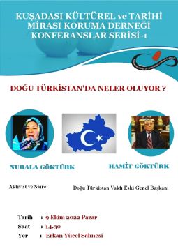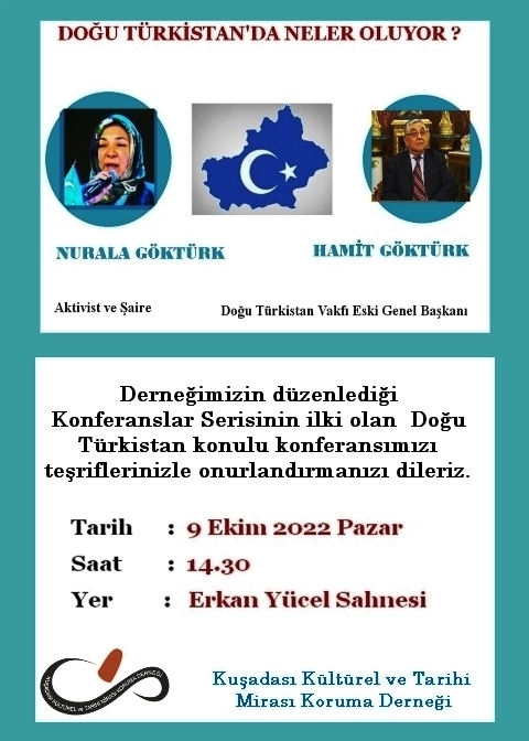 Kuşadası Kültürel ve Tarihi Mirası Koruma Derneği 2022-23 döneminde Türk Kültürü ve Tarihi alanlarında Ekim-Haziran arası ayda bir seri konferanslar düzenleyecek. Bu konferansların ilki, Doğu Türkistan Vakfı Eski Genel Başkanı sayın Hamit GÖKTÜRK ve Aktivist eşi sayın Nurala GÖKTÜRK tarafından “ Doğu Türkistan’da Neler Oluyor? “ başlığıyla verilecek. 9 Ekim 2022 Pazar günü saat 14.30 da Kuşadası Belediyesi Erkan Yücel Sahnesindeki bu güzel konferansa tüm Kuşadası hemşerilerimizin ve Sivil Toplum kuruluşlarının teşriflerini bekliyoruz.