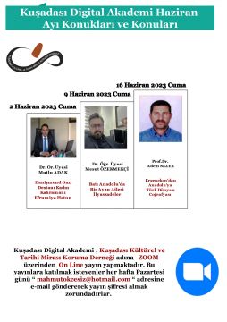 Kuşadası Digital Akademi 2022-2023 Döneminde Üçüncü Yayın Yılını Haziran ayında üç ayrı konuğuyla tamamlayacaktır. Bu ayın ilk konuğu 2 Haziran 2023 Cuma günü Adnan Menderes Üniversitesi Dr. Öğr. Üyesi Mutlu ADAK olacaktır. Mutlu bey ; “ Danişmend Gazi Kadın Kahramanı Efrumiye Hatun “ adlı ilginç ve pek bilinmeyen bir kadın kahramanımızı anlatacak. İkinci konuğumuz 18 Mart Üniversitesi Dr. Öğretim Üyesi Mustafa Mesut ÖZEKMEKÇİ’ dir. Mesut bey ; “ Batı Anadolu’da Bir Ayan Ailesi İlyaszadeler” adlı ilginç ve Ege bölgesini yakından ilgilendiren bir konu hakkında bizi bilgilendirecek. Haziran ayındaki son konuğumuz Uşak Üniversitesi Öğretim üyesi Prof. Dr. Adem SEZER olacak. Adem bey ; “ Ergenekon’dan Anadolu’ya Türk Dünyası Coğrafyası” adlı güncel ve ufkumuzu açan güzel bir konferans verecektir. Görselde de belirtildiği üzere bu ilginç konferanslara katılmak isteyenlerin “ mahmutokcesiz@hotmail.com” adresine mail gönderip kayıt olmaları gerekmektedir. Kamuoyuna saygıyla ilan olunur.