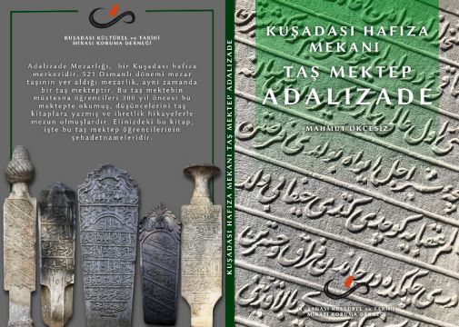 İkincisi Adalızade mezarlığını ve bu açık hava müzesini anlatan, 138 sayfadan, 6 ana bölümden ve 3 eklerden oluşan “ Kuşadası Hafıza Mekanı Taş Mektep Adalızade “ adlı bir kitabı tamamladık. Derneğimizin 13. yayını olacak bu kitabı 16.5 X23 cm ebadında ve renkli kapak olarak 200 tane yakında kendi imkanlarımızla bastıracağız. Kitabın altı ana bölümleri ; “ Türk defin kültürü, Kuşadası Eski Mezarlıkları, Adalızade Mezar Taşları, Taşlardaki Adalızade , Tarihi mezarlıkları koruma ve Adalızade Mezar Taşları Sergi Reyonları “ olarak yazıldı. Son üç bölüm ise; ek belgeleri, kısa bir sözlüğü ve yararlandığımız kaynakları kapsamaktadır. Özellikle “ Adalızade Taş Mektep “ kitabını mezarlıkta ataları medfun “ Gerçek Kuşadalıların “almalarını ve okumalarını candan arzu ediyoruz.