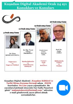 Kuşadası Digital Akademi olarak Ocak ayında dört seçkin konuk ve dört ilginç konu ile karşınızda olacağız. 5 Ocak 2024 Cuma günü ilk konferansımızın konuğu Moldova Gök Oğuz Türklerinden Gagauziya M. Maruneviç Bilim Araştırma Merkezi Müdürü Dr. Irina KONSTANTINOVA olacaktır. Irina hanım ; “ Gagavuzya ve Gagavuz Türkleri “ adlı güzel bir konferans verecek. Ocak ayı ikinci konuğumuz 12 Ocak 2024 Cuma günü Gazi Üniversitesi Dr. Öğretim Üyesi Yakup ÖMEROĞLU hocadır. Yakup Bey , “ Kardeş Kalemler ve Türk Dünyası Edebiyatı “ konusunu bize anlatacak. Ocak ayı üçüncü konuğumuz 19 Ocak 2024 Cuma günü Araştırmacı Yazar ve Tarihçi Mustafa UZEL dir. Mustafa bey, “ Yeniçeri Ocağı ve Remizleri “ adlı çok ilginç bir konuyu işleyecek. Ocak ayı dördüncü ve son konuğumuz 26 Ocak 2024 Cuma günü Kosova Priştina Üniversitesi Öğretim Üyesi Prof. Dr. Ergin JABLE olacaktır. Ergin bey ; “ Balkanlarda Türkçe ve Türkler “ adlı konferansıyla Balkanlardaki Ses Bayramız Türkçe ve Evlad-ı Fatihanı anlatacak. Akademi yayınlarını sürekli online (çevrimiçi) izlemek isteyenler mutlaka abone olmak zorundadırlar. Akademimize abone olmak isteyenler 0 532 3474319 nolu telefonu arayarak veya mahmutokcesiz@hotmail.com adresine mail atarak detaylı bilgi edinebilirler. Kamuoyuna saygı ile ilan olunur.
