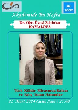 Kuşadası Digital Akademide bu hafta, 22 Mart 2024 Cuma günü saat 21. 00 de, İstanbul Ticaret Üniversitesi Dr. Öğretim Üyesi Zebiniso KAMALOVA konuğumuz olacaktır. Zebiniso hanım , “ Türk Kültür Mirasında Kalem ve Kılıç Tutan Hanımlar “adlı önemli bir konferans verecektir. Bu önemli konferansa katılmak isteyenlerin 22 Mart 2024 Cuma günü saat 18.00 kadar “ mahmutokcesiz@hotmail.com “ adresine mail gönderip kayıt olmaları gerekmektedir. Kontenjanımızın sınırlı olduğunu belirtir, acele edilmesini tavsiye ederiz. Kamuoyuna saygıyla ilan olunur.
