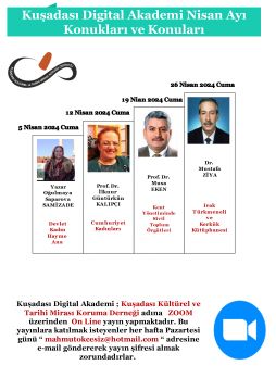 Kuşadası Digital Akademi olarak Nisan ayında dört seçkin konuk ve dört ilginç konuyla karşınızda olacağız. 5 Nisan 2024 Cuma günü ilk konferansımızın konuğu Türkmen yazar sayın Oğulmaya Saparova SAMİZADE olacaktır. Oğulmaya Hanım ; “ Devlet Kadın Hayme Ana “ adlı güzel bir konferans verecek. Nisan ayı ikinci konuğumuz 12 Nisan 2024 Cuma günü Atatürk araştırmalarıyla tanınan Prof. Dr. İlknur Güntürkün KALIPÇI hocadır. İlknur Hanım , “Cumhuriyet Kadınları “ konusunu bize anlatacak. Nisan ayı üçüncü konuğumuz 19 Nisan 2024 Cuma günü Sakarya Üniversitesi Öğretim üyesi sayın Prof. Dr. Musa EKEN hocadır. Musa Bey, “ Kent Yönetiminde Sivil Toplum Örgütleri “ adlı çok ilginç bir konuyu işleyecek. Nisan ayı dördüncü v son konuğumuz 26 Nisan 2024 Cuma günü Türkmeneli Vakfı Üyesi ve şair-yazar Dr. Mustafa ZİYA olacaktır. Mustafa Bey ; “ Irak Türkmeneli ve Kerkük Kütüphanesi “ adlı konferansıyla Irak Türkmeneli ve kurulacak Kerkük Kütüphanesi konularında bizleri aydınlatacak. Akademi yayınlarını sürekli online (çevrimiçi) izlemek isteyenler mutlaka abone olmak zorundadırlar. Akademimize abone olmak isteyenler 0 532 3474319 nolu telefonu arayarak veya mahmutokcesiz@hotmail.com adresine mail atarak detaylı bilgi edinebilirler. Kamuoyuna saygı ile ilan olunur.