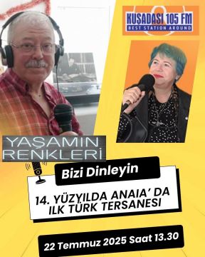 Yarın-22 Temmuz 2025 Salı- Kuşadası’nın 33 yıllık radyo programları duayeni sevgili Belma ÖZGÜN hanımefendinin “ Yaşamın Renkleri “ programına konuk olacağız. Saat 13.30 da başlayacak olan programda “ 14. Yüzyılda Anaia’da İlk Türk Tersanesi “ konulu güzel bir söyleyişi gerçekleştireceğiz. Denizci Türk beyliklerinden en önemlisi olan Aydınoğlu Beyliğinin Anaia’yı ele geçirmesini, buradaki tersanede Türk gemilerinin yapımını, 340 parça gemilik bir armadanın nasıl oluştuğunu, Selçuk’a neden tersanenin Kuşadası’ndan taşındığını anlatacağız. Kuşadası’nda ilk Türk tersanesinin önemini ve kentimiz için değerini vurgulayacağız. Tarihe, bilhassa Türk denizciliğine ilgisi olanları ve vaktim müsait diyenleri söyleyişimize davet ediyoruz. Bekleriz efendim.