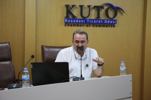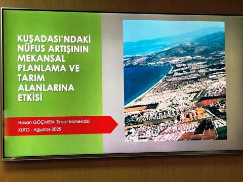 Yukarıdaki kısaca özetlediğimiz idari yapılanma ve nüfus hareketlerini detaylıca anlatan Hasan Göçmen bey, konuşmasına devam ederek 2009 yılında kabul edilen Aydın-Muğla-Denizli planlama bölgesi 1/100.000 ölçekli Çevre Düzeni planını hakkında bilgiler verdikten sonra Kuşadası tarım alanlarını koruyan ve koruyamayan kanunları bize gösterdi. 2007 yılında tespit edilen tarım alanlarıyla 2024 yılında tekrar ölçülen tarım alanlarının giderek küçüldüğünü ve konut alanlarının da giderek çoğaldığını grafiklerle katılımcılara anlattı. Kuşadası tarım alanlarındaki ürün desenlerinin zeytin, şeftali, mandalina, incir ve üzüm olduklarını yıllık ürün rekolteleriyle birlikte verdi. İlçemizdeki tarım alanlarının % 72 sinin dikili alanlar ve % 28 inin açık tarım alanları gerçeğini de öğrendik.