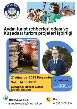 Kuşadası İlim Meclisi tarafından düzenlenen Perşembe konferanslarında bu haftaki konuğumuz Aydın Turist Rehberleri Odası Başkanı sayın Ozan GÜNDÜZALP olacaktır. “ Aydın turist rehberleri odası ve Kuşadası turizm projeleri işbirliği “ adlı konferans 21 Ağustos 2025 Perşembe günü 15.00-16.30 saatleri arasında Kuşadası Ticaret Odası 3. Kat Meclis Salonundaki yapılacaktır. Bu güzel konferansa ve bilgilendirmeye sınırlı sayıda misafir izleyici alınacaktır. Kayıt olmak zorunludur. Katılmak isteyenler 0 532 3474319 nolu telefondan veya mahmutokcesiz@hotmail.com adresinden isimlerini yazdırmalıdırlar. Saygıyla ilan olunur.