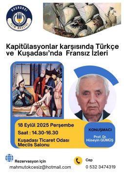 Kuşadası İlim Meclisinin 10. toplantısı 18 Eylül Perşembe günü Kuşadası Ticaret Odası Meclis Salonunda yapılacaktır. Bu haftaki konuğumuz Marmara Üniversitesi Öğretim Üyesi Prof. Dr. Hüseyin GÜMÜŞ bey “ Kapitülasyonlar karşında Türkçe ve Kuşadası’nda Fransız izleri “ adlı ilginç bir konferans verecektir. Bu konferansa katılmak isteyenler 0 532 3474319 nolu telefondan veya mahmutokcesiz@hotmail.com adresine kayıt yaptırabilirler. Kamuoyuna saygıyla ilan olunur.