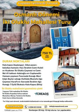 Bu kültür ve tarih turlarından ilki olan “ Osmanlı dönemi İki Oluklu Mahallesi “ yürüyüş turu 26 Kasım 2025 Pazar günü yapılacaktır. Kontenjan 20 kişiliktir ancak en az 10 kişi olunca tur kesinlikle icra edilecektir. Kuşadası’nın hafıza mekanı, Osmanlı milletlerinin 300 yıl birada yaşadığı bu mahalle gerçekten gezilmeye ve hikayesi dinlenmeye değer bir hazinedir. Bir zamanlar cami-havra-kilise üçlüsünün bir arada olduğu iki oluklu, günümüzde yaşayan ve eski geleneklerimizin uygulandığı tek Türk mahallesidir.