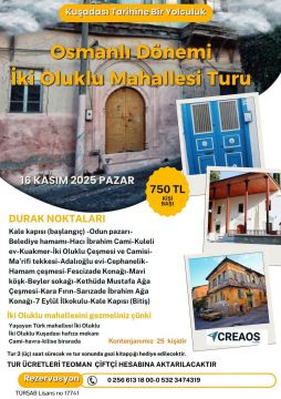 Creaos Seyahat Acentesi olarak bu yıl başlattığımız “ Kuşadası Kültür ve Tarih Turları” nın 4. yoğun istek üzerine Osmanlı dönemi İki Oluklu Mahallesi Turu olarak 16 Kasım 2025 Pazar günü yapılacaktır. Bu turu ulvi bir amaç için düzenledik ve turun gelirini direkt olarak SMS hastası yavrumuz TEOMAN ÇİFTÇİ hesabına aktaracağız. Pazar günü 09.00-12.30 saatleri arasında yapılacak bu özel turun kontenjanı 25 kişidir. Kuşadalı hemşerilerimizin katılmalarını bekliyoruz.