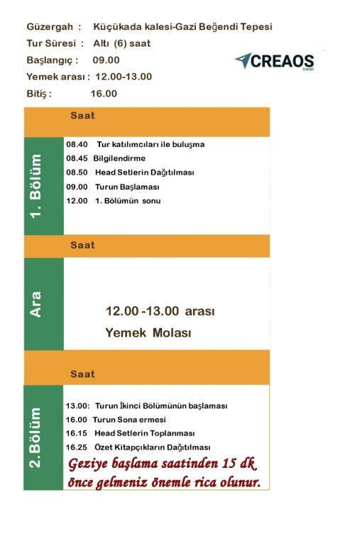 Tam gün- altı (6) saat süren bu Kuşadası şehir içi turunda 1538 de Barbaros Hayreddin Paşa ile başlayan şehir tarihi hakkında detaylı bilgi Küçük ada (Güvercinada) kalesi önünde verildikten sonra turumuz başlayacaktır.