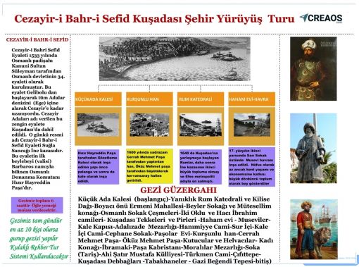 Kuşadası Şehir İçi Turunda kente çok büyük hizmetleri olan " Hızır Hayreddin Paşa, Vezir Konevi Mehmet Paşa ve Cezayirli Gazi Hasan Paşa " tüm yönleriyle geziye katılanlara anlatılacaktır.