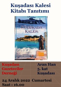 24 Aralık 2022 Cumartesi günü (yarın) Kuşadası Gazeteciler Derneği’nde son yayınladığımız “ Küçükada Kalesi “ kitabımız konusunda konuşacağız ve katılanlara kitaplarımızı imzalayarak takdim edeceğiz. Bu etkinlik saat 16.00 başlayacak ve Aran Han 5. Kattaki dernek binasında olacaktır. Etkinliğin görseli ektedir. Tüm Kuşadası halkını kitabımızın tanıtımına bekleriz.