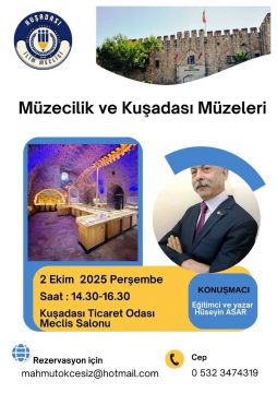 Kuşadası İlim Meclisinin 11. toplantısı 2 Ekim 2025 Perşembe günü Kuşadası Ticaret Odası Meclis Salonunda yapılacaktır. Bu haftaki konuğumuz emekli öğretmen, gazeteci ve yazar Hüseyin ASAR bey olacaktır. Hüseyin hoca“ Müzecilik ve Kuşadası Müzeleri “ adlı çok güzel bir konferans verecektir. Bu konferansa katılmak isteyenler 0 532 3474319 nolu telefondan veya mahmutokcesiz@hotmail.com adresine kayıt yaptırabilirler. Kamuoyuna saygıyla ilan olunur.
