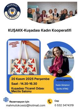 Kuşadası İlim Meclisinin 14. toplantısı 20 Kasım 2025 Perşembe günü Kuşadası Ticaret Odası Meclis Salonunda yapılacaktır. Bu haftaki konuğumuz Kuşadası Kadın Girişimcilerinin duayeni ve KUŞAKK kadın kooperatifinin kurucu başkanı sayın Şerife ATINÇ Hanım ve kooperatif ortakları olacaktır. Şerife hanım ve arkadaşları ; “ KUŞAKK- Kuşadası Kadın Kooperatifi “ nin nasıl kurulduğunu ve bugünü hakkında konferans vereceklerdir. Bu konferansa katılmak isteyenler 0 532 3474319 nolu telefondan veya mahmutokcesiz@hotmail.com adresine kayıt yaptırabilirler. Kamuoyuna saygıyla ilan olunur.
